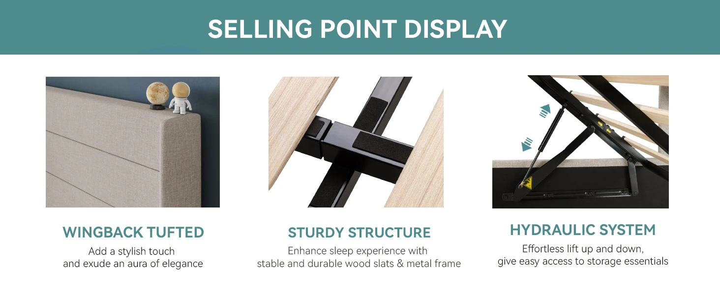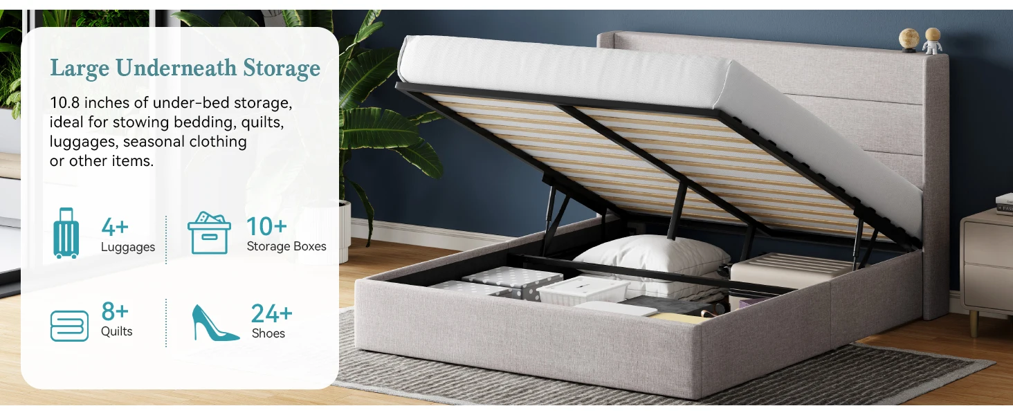 Space-Saving Storage: With its lifting up storage feature, this bed frame provides ample space to store extra bedding, clothing, shoes, and other items, especially helpful for smaller bedrooms or apartments where storage space is limited