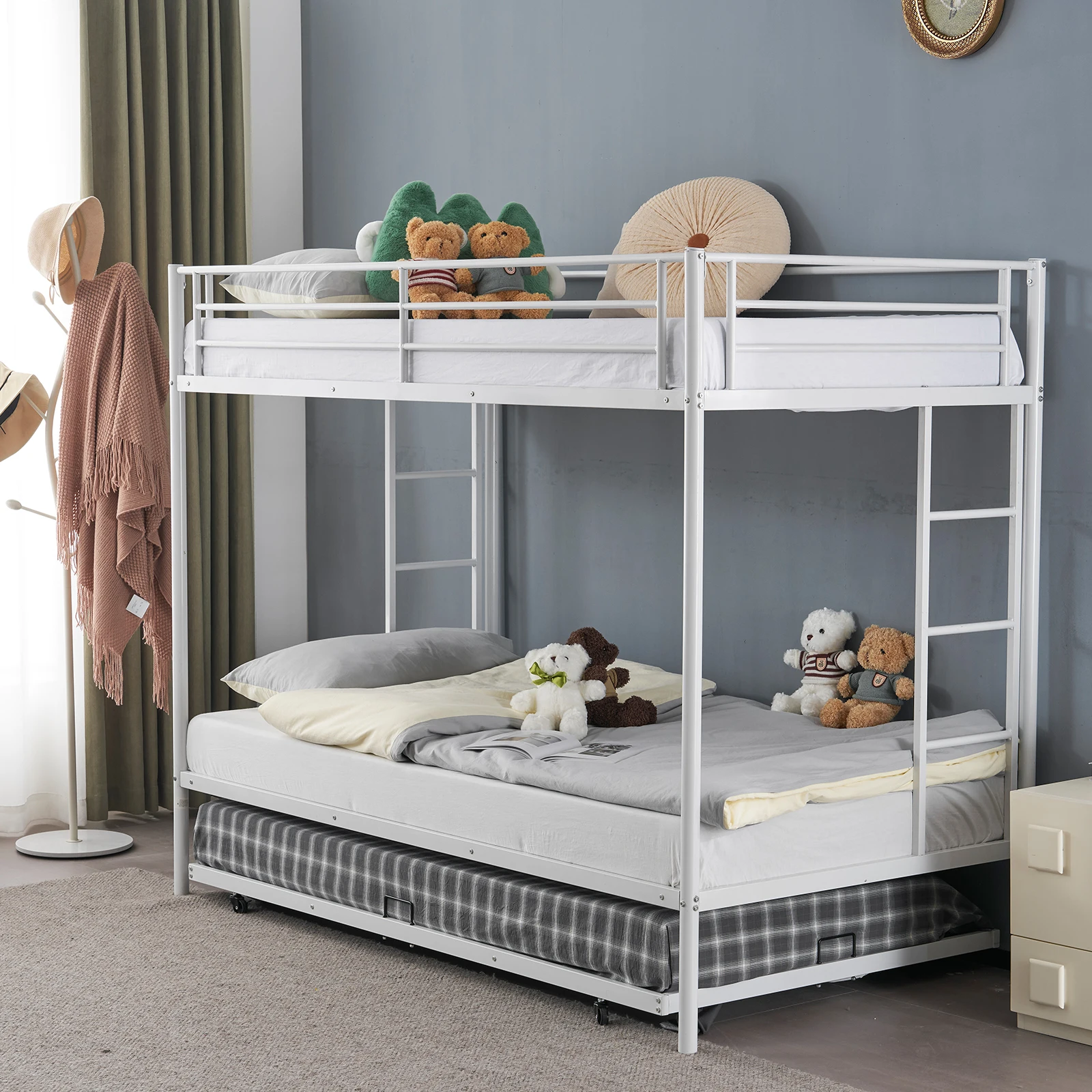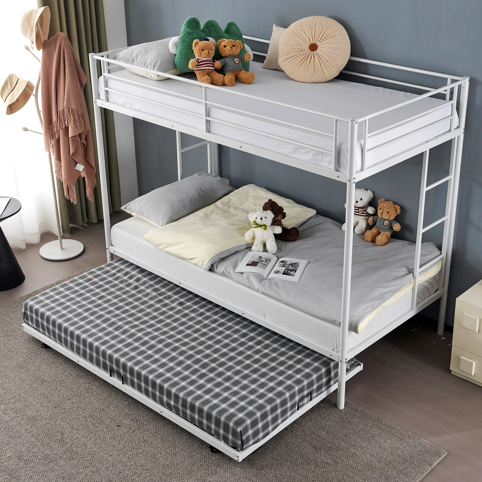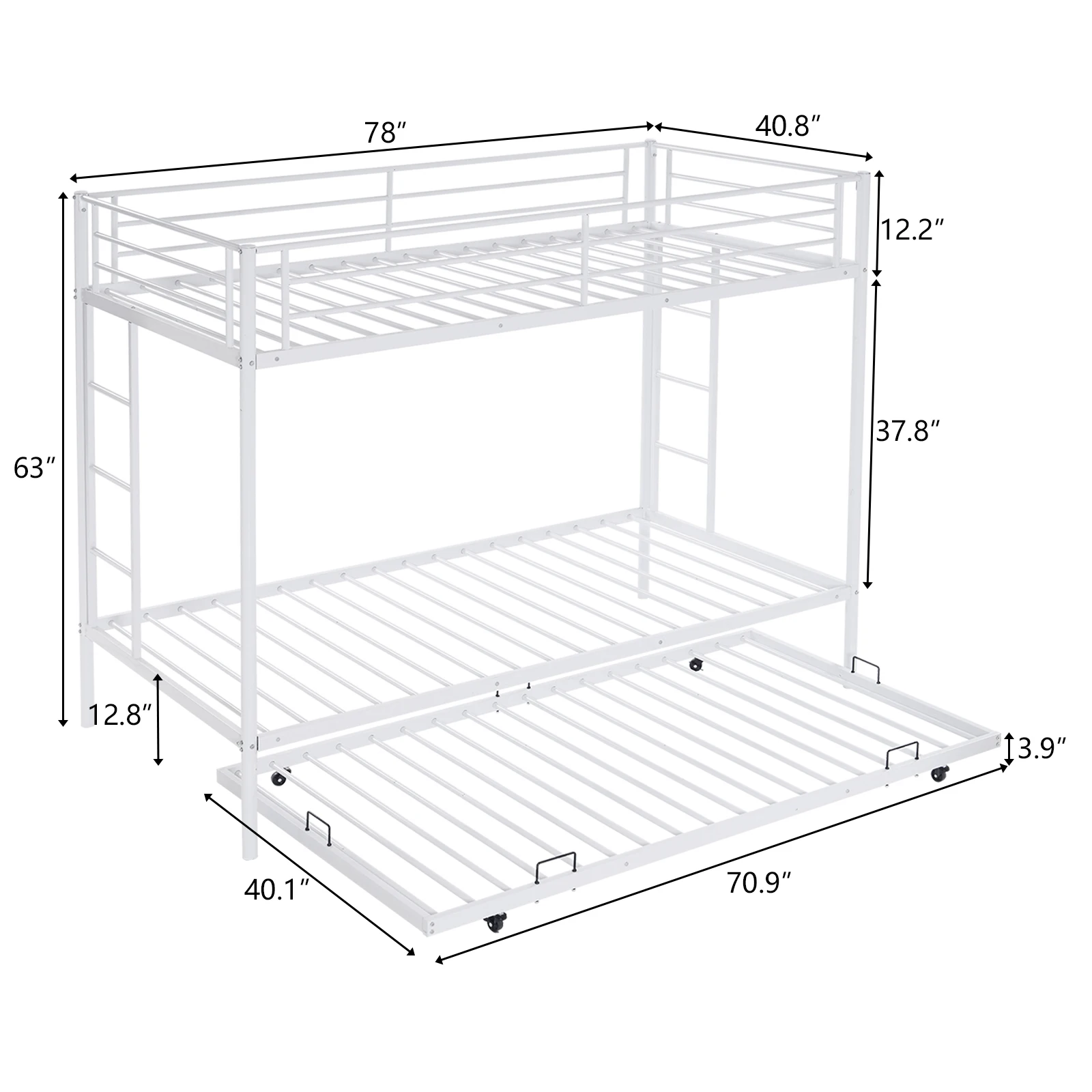 Maximize your space while offering a sleek, safe, and comfortable sleeping arrangement with this Twin Over Twin Bunk Bed with Trundle. Perfect for kids, teens, and adults, this triple-layered bunk bed showcases a smart, space-saving design, making it a great addition to any bedroom or guest room. The inclusion of a trundle with lockable wheels provides an extra sleeping space that is both convenient and discreet. With its robust metal frame and minimalistic line design, this bunk bed is both practical and stylish.