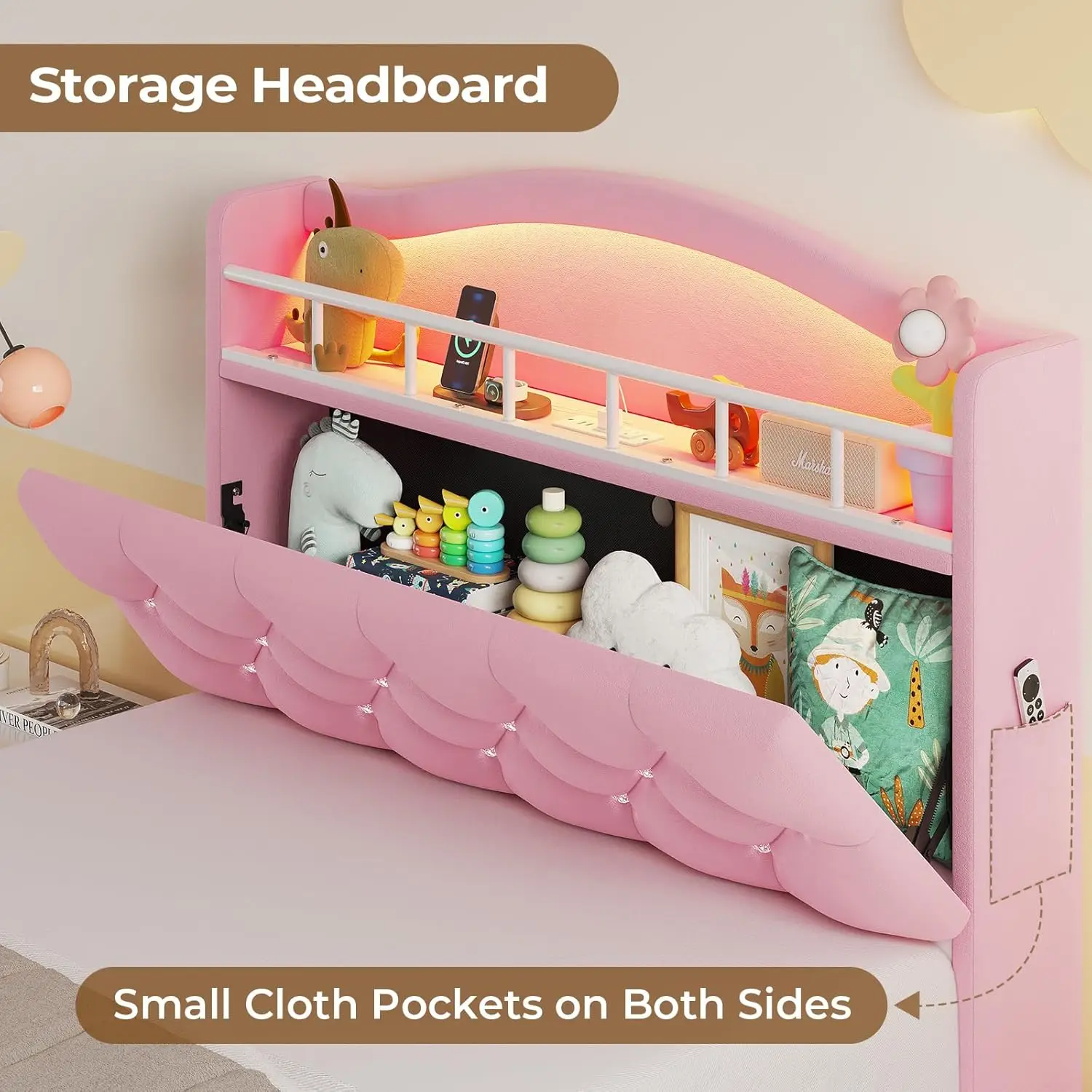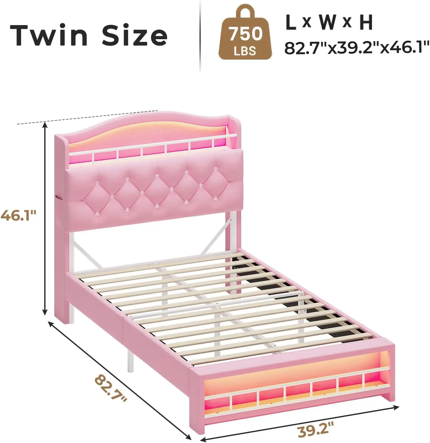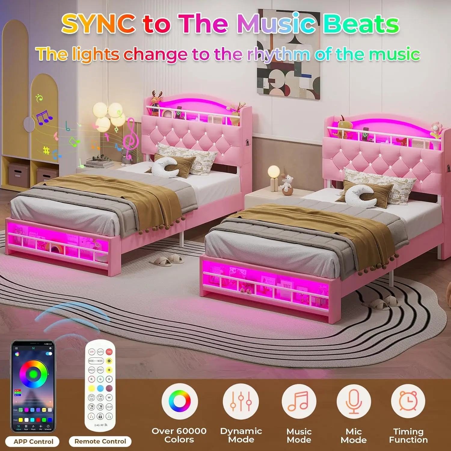 - Multi‑color RGB LED lighting: Integrated LED strips on the headboard and footboard offer over 60,000 colors and multiple lighting modes. Control lights via phone app or included remote to set brightness, color, effects, and timers.